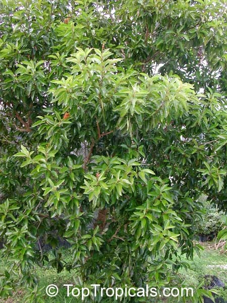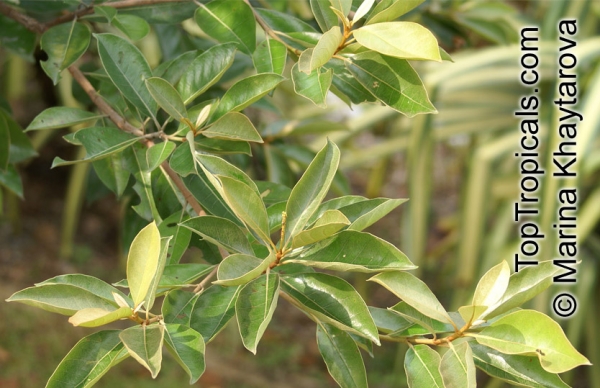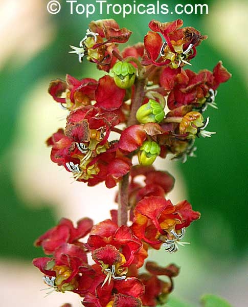 immergrüner, kleiner Baum bis zu 7 m (am Naturstandort bis zu 15 m) mit gegenständig angeordneten, elliptischen, glänzend tiefgrünen Blättern mit auffälliger Nervatur und bronzefarbenem Neuaustrieb. Die strahlend gelben, im Alter über orange bis roten Blüten erscheinen in dichten, aufrechten Rispen, gefolgt von eßbaren, ca. 2 cm großen, bei Reife gelben Beerenfrüchten