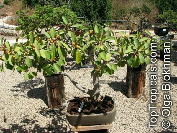 Eine Würgefeige mit ledrigen, glänzend grünen Blättern und kleinen, orangen Früchten. In Kultur bilden die Pflanzen gewöhnlich eine sehr breite Krone und nur einen kurzen, dicken Stamm.