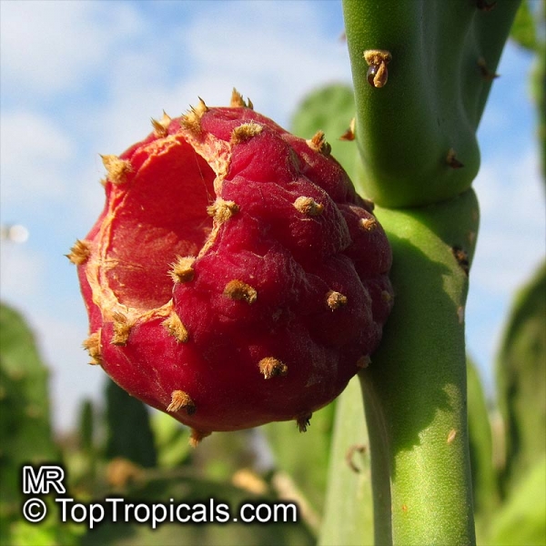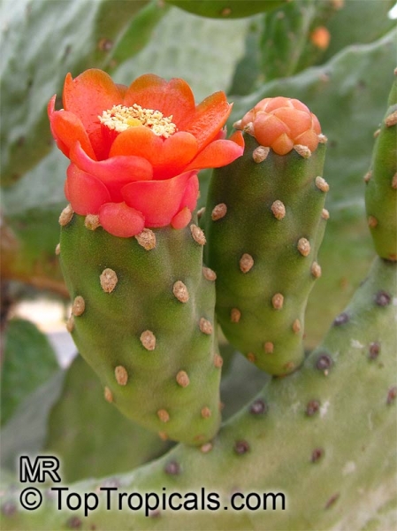 wächst strauchig oder baumartig und erreicht Wuchshöhen zwischen 1 und 6 Metern. Meist ist ein deutlicher Stamm von bis zu 35 Zentimetern vorhanden. Die Blüten stehen endständig am Spross, sind gelb bis rot und haben einen Durchmesser von 5 bis 10 Zentimeter. Die eiförmigen bis länglichen, grünen, orangen oder roten Früchte sind 6 bis 10 Zentimeter lang. Sie sind mit Glochiden und manchmal mit Dornen besetzt.