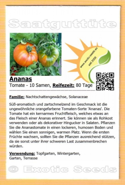 Süß-aromatisch und zartschmelzend im Geschmack ist die ungewöhnliche orangefarbene Tomaten-Sorte 'Ananas'. Die Tomate hat ein kernarmes Fruchtfleisch, welches etwas an das Fleisch einer Ananas erinnert. Sie können sie als Rohkost verwenden oder als dekorativer Hingucker in Salaten. Pflanzen Sie die Ananastomate in einen lockeren, humosen Boden und wählen Sie einen sonnigen, warmen Platz. Wenn die ersten Früchte wachsen, sollten Sie die Pflanzen ausreichend stützen, da sie sonst unter ihrer schweren Last zusammenbrechen würden.