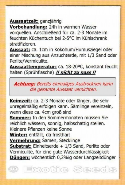 Keimzeit: bis Keimung erfolgt, ca. 2-3 Monate in feuchtem Substrat bei 2-5°C im Kühlschrank