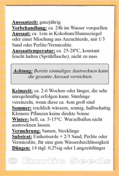 (Saatgut ist verpackt in einer Pergamyn-Saattüte mit umseitiger Aussaat und Pflegeanleitung für eine erfolgreiche Anzucht)