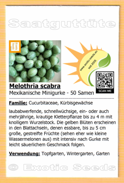 laubabwerfende, schnellwüchsige, ein- oder auch mehrjährige, krautige Kletterpflanze bis zu 4 m mit knolligem Wurzelstock. Die gelben Blüten erscheinen in den Blattachseln, denen essbare, bis zu 5 cm große, gestreifte Früchte (sehen eher wie kleine Wassermelonen aus) mit intensiv nach Gurke mit leicht säuerlichem Geschmack folgen.